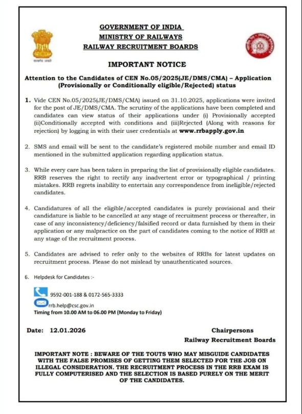Railway Recruitment Board (RRB), Ministry of Railways ne Junior Engineer (JE) Recruitment (CEN 05/2025) ke liye RRB JE 2026 Exam Date Released Application Status official website par release kar diya hai.